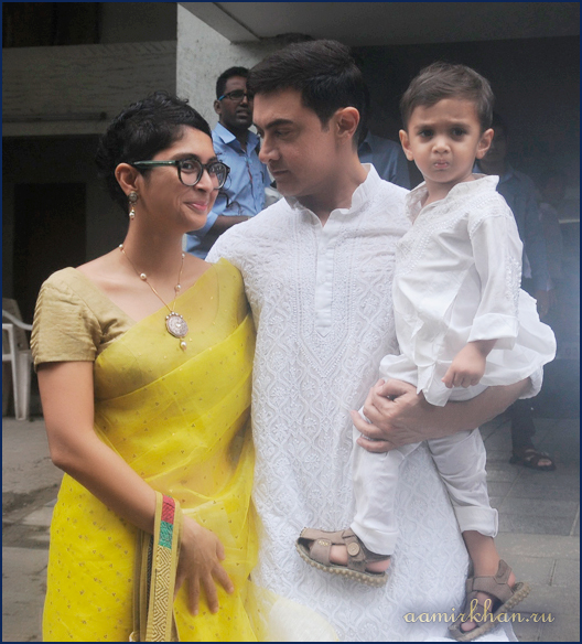Aamir Khan's Eid Bonhomie With Khan-daan.Bollywood actor Aamir Khan celebrated the festival of Eid at home with his family in Mumbai on July 29.He poses for a photograph with wife Kiran, lovely in a yellow sari and son Azad Rao Khan who looked adorable in a white kurta.