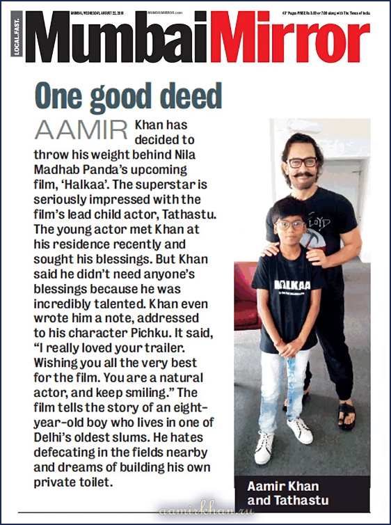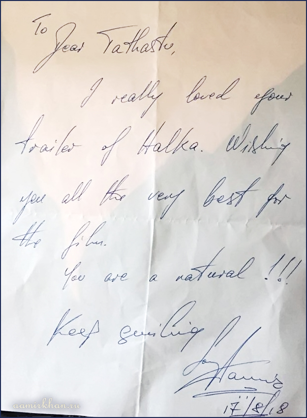 Посмотрев недавно выпущенный трейлер фильма Halkaa, Аамир Кхан был очень впечатлен игрой юного актера Татхасту, исполняющего главную роль - мальчика Пичку. Он даже написал мальчику письмо: