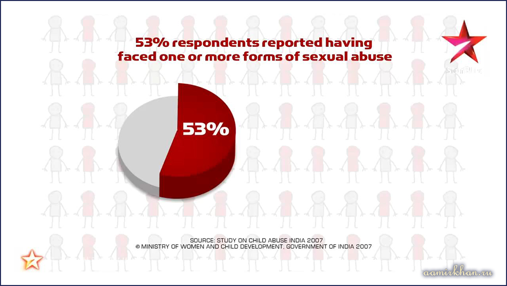 одноголосый закадровый (по субтитрам): kraffty/SKR Studio - описание: Сексуальное насилие над детьми - ужасающая реальность наших дней, но многие до сих пор не знают истинных размеров этой проблемы. Исследование показало, что в Индии 53 % (или каждый второй ребенок!) является жертвой сексуального насилия. Вопреки распространенному мнению, что дома наши дети в безопасности, родной дом для детей уже не является "защищающей крепостью", так как многие случаи насилия - дело рук самих членов семьи. Аамир говорит о необходимости введения дополнительных мер, посредством которых, дети будут получать психологическую помощь. Чтобы каждый ребенок смог сказать "стоп" насилию над собой. Также Аамир, обращает внимание на важную роль родительской чувствительности. Он призывает родителей больше доверять своим детям и быть более внимательными к ним. Решение у проблемы только одно - ужесточение мер наказания за подобные преступления. Об этом и о многом другом - второй выпуск шоу Аамира Кхана "Правда всегда торжествует".