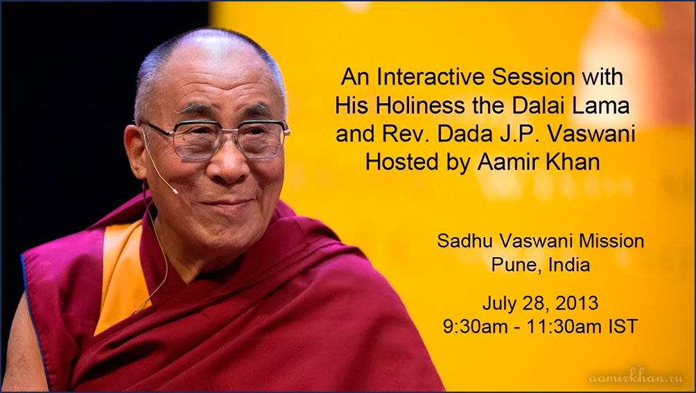 An Interactive Session with His Holiness the Dalai Lama and Rev. Dada J.P. Vaswani, hosted by Aamir Khan on Sunday July 28 at 9:30am to 11:30am Indian Standard Time (IST) from the Sadhu Vaswani Mission in Pune as part of Rev. Dada J.P. Vaswani's 95th birthday celebrations.