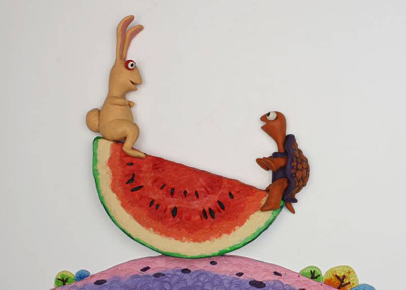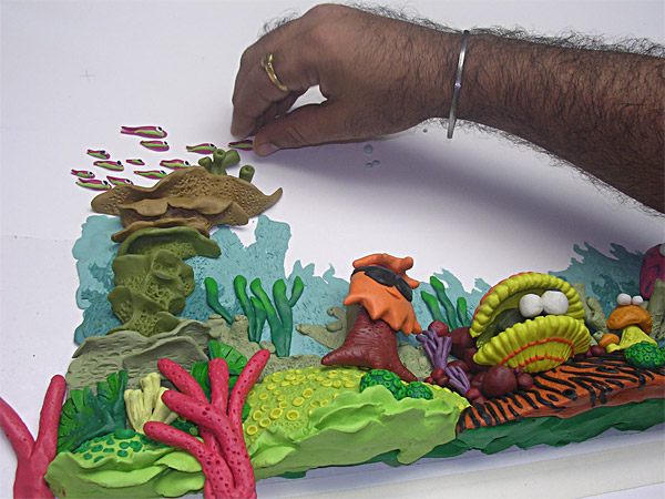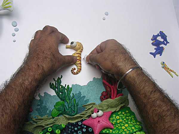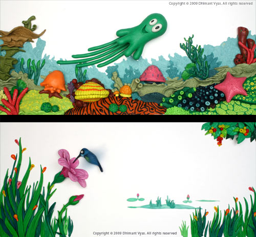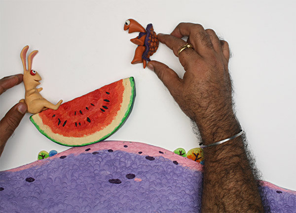 I use my own technique which I like to call embossed clay illustration. It is different from typical clay animation, as the clay figures don’t stand upright but are laid out flat on a smooth surface. It is technically easlier to animate in this manner as it requires less planning than when armatures are used. Light is used to give the almost 2D surface the look and feel of a three dimensional one. The illusion of depth comes from the play of light and shadows. But the light has to be planned carefully or else it will throw unnecessary shadows. This steals the volume. So the challenge is in creating a model that looks three dimensional under the camera. You have to cheat a lot. When you look at the model by itself, its shape looks odd but when looked at through the camera lens, it is perfect. The camera is set up to film the animation from the top. We used 2 cameras - a web cam to check the animation frame by frame and another Canon digital SLR for capturing the final hi-res stills.