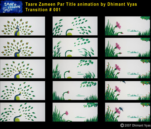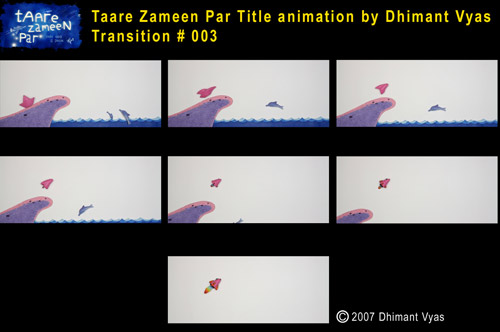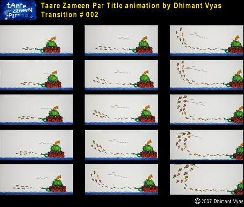 The title where the name of the film Taare Zameen Par morphs from English to Hindi to Urdu, the movement of the octopus, fish and parrot was shot against a blue, red and then a green screen placed under the glass. The team at Tata Elxsi composited those shots.