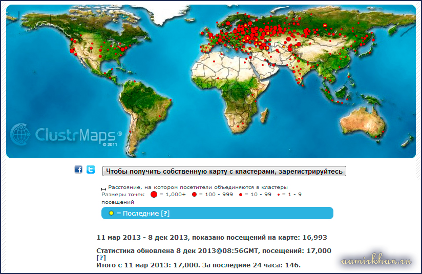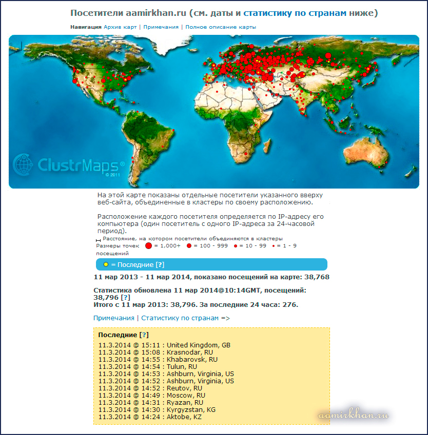 Вот некоторая статистика посетителей... Подробнее можно все поразглядывать на clustrmaps.com, пройдя по ссылке-превью, которая расположена в самом низу любой страницы сайта. 11 марта 2014 г.