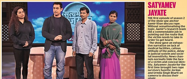 Rape for long was restricted largely to the news channels but Aamir Khan, true to form, presented various aspects associated with the social menace and its victims. Rape survivors Suzette Jordon from Kolkata and Urmila Singh Bharti, a Dalit from Madhya Pradesh, made an appearance on national TV on the show.